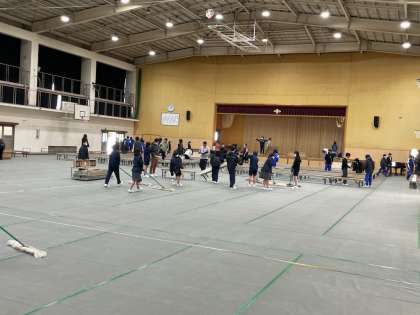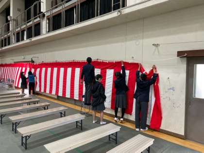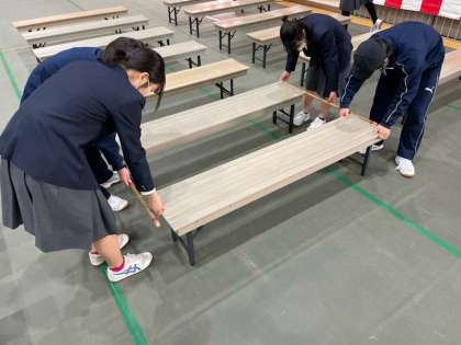 卒業証書授与式準備の様子です。15日(水)の本番に向けて,会場準備や校内清掃等、役割分担を決めて行いました。3年生の門出にふさわしい素晴らしい舞台が整いました。