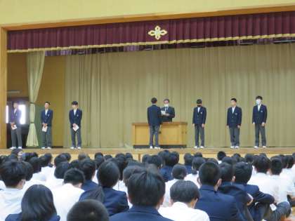 本日6限に前期学級役員認証式が行われました。各クラスの学級役員(評議・生活・環境・保健安全・文化図書・体育・広報)を認証し、今日から前期の委員会活動が始まります。「責任をもってがんばりましょう」と、生徒会長からの言葉。校長先生からも激励のお言葉をいただきました。