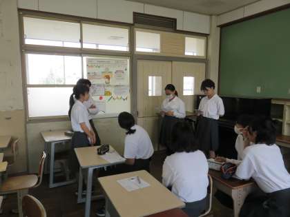2年生では職場体験についてポスターにまとめ、ポスター発表会を行いました。7月には1年生に向けて発表を行うので、そのリハーサルとしての位置付けです。それぞれ発表者と聞き手になり緊張しながらも一生懸命伝えようとしていました。今回の反省を生かし、次の1年生への発表に向けてさらに改善を加えてよりよいものにしていきます。