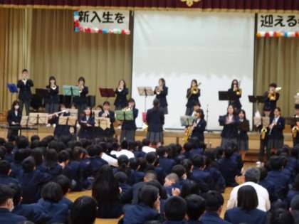 4月12日(金)5.6限に新入生を迎える会が行われました。吹奏楽部の演奏、部活動や委員会の紹介、2,3年生からの発表がありました。終始、和やかで温かい雰囲気でした。