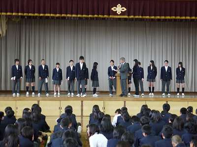 本日(5月1日)前期学級役員の認証式が行われました。校長先生から代表クラスの学級役員へ認証書が手渡されました。次に生徒会長より,「それぞれの学級から生徒会活動を盛り上げていこう」という話がありました。