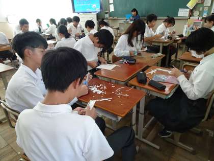 洛南マルシェ、合唱コンクールの取組に加えて、5日から文化祭で展示する貼り絵作品の制作がスタートしました。今年度の貼り絵はは洛南マルシェと関連付け「輪島キリコ」を表現します。初日は色紙を切る作業でした。どんな作品に仕上がるのか,楽しみです。