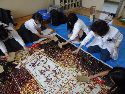 10月11日の文化祭に向けて,貼り絵の作業が大詰めです。展示係が全クラスのパーツをのりでくっつけて,剥がれ落ちた色片を丁寧に貼り直しました。貼り合わせる際も,右左逆に貼ってしまったり,そこまで進んでいないクラスがあり,てんてこ舞いでしたが,展示係の根気強い作業でなんとか全クラスを貼り合わせることができました。展示係以外の人も大勢手伝ってくれました。お疲れさまでした。完成までもう少しです。