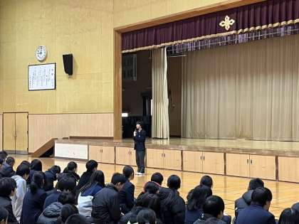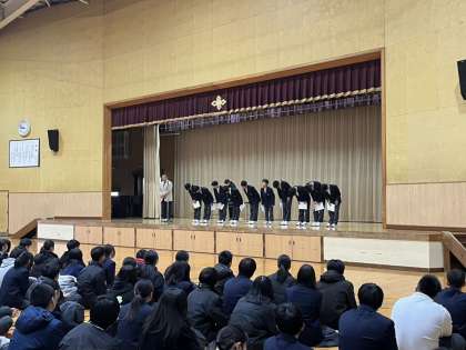 寒い中でしたが全校生徒が体育館に集まり、伝達表彰と終業式を行いました。伝達表彰では秋以降に部活動やコンクールで活躍した多くの生徒が表彰されました。終業式では、校長先生と生徒会長から話がありました。明日からは冬休みになります。短い期間にはなりますが、1月7日の始業式には元気な姿を見せてください。みなさん良いお年をお迎えください。