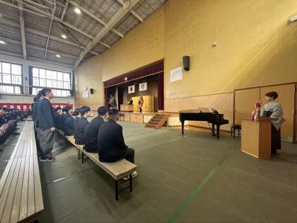 第77回卒業証書授与式が行われました。厳粛な雰囲気の中、卒業生一人ひとりが担任の先生からの呼名に大きな声で返事をしていました。在校生代表の送辞、卒業生代表の答辞、「旅立ちの日に」の合唱、どれもすばらしく、感動の卒業証書授与式となりました。卒業生の今後のますますの飛躍を期待しています。