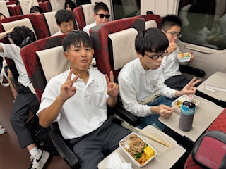 京都から出発したサンダーバードは敦賀駅に無事到着し、北陸新幹線はくたかに乗替え後、出発しています。新幹線内の昼食の様子です。みんないい顔してますね!金沢に到着後は班別研修ですね。しっかり食べてパワーを充電しておいて下さい!