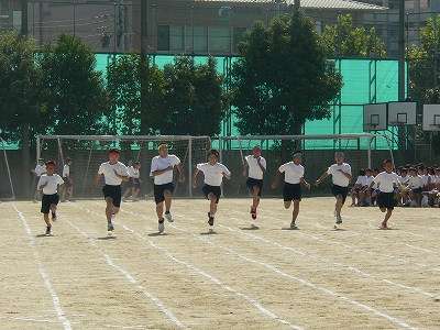 今年度から、大きなグランドを生かして、男子100m走と女子80m走を直線で実施しました。1年生から3年生まで、どの生徒も自分の持てる力を最大限に発揮しようと頑張って走っていました。満席の保護者席からも、頑張れと言う声がかかっていました。