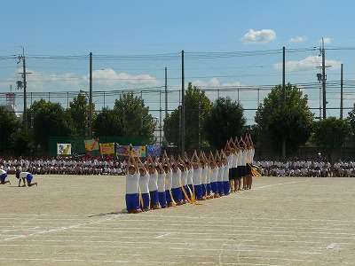 午後の部の最初に、洛南中学校の体育祭の名物の一つである各団(赤・青・黄)対抗の「応援合戦」が行われました。3年生を中心に教室でビデオを見て振り付けを覚え、廊下やグランドの隅で各団とも主体的に練習に取り組んできました。その練習の成果を発表するべく、よい緊張感のもと応援合戦が実施されました。各団とも甲乙つけがたい迫力あるできばえでした。来賓の方々、PTAのみなさま、副担任の先生方の審査を合計した結果、優勝は青組でした。立ち見席もでた保護者席から、惜しみない拍手がわき上がっていました。