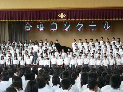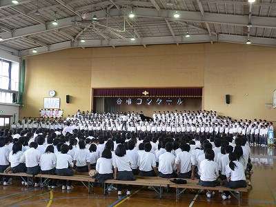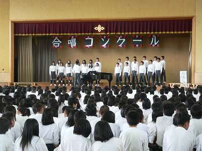 最高学年の3年生、日々の練習の中で、男女別の各パートに分かれて、しっかりと練習に取り組んでいました。本番当日が近づくにつれて、どのクラスの生徒たちも入賞を目指して目の色が変わってきました。その気持ちを表現するかのように、どのクラスの発表も聴衆を感動させるすばらしい歌声でした。増やした保護者席も満席になるくらい多くの保護者に来ていただき、大きな拍手をいただきました。クラスの発表順と曲目は次の通りです。1番:10組「さよならの季節に」、2番:1組「走る川」、3番:9組「さくら」、4番:2組「名づけられた葉」、5番:5組「春に」、6番:3組「信じる」、7番:8組「二十億光年の孤独」、8番:7組「旅立ちの時」、9番:6組「予感」、10番:4組「わが里程標(マイルストーン)」です。学年合唱「大地讃頌」は体育館を揺さぶるような迫力のある大合唱でした。1年生から3年生のみなさんの頑張りに大きな拍手を送りたいと思います。