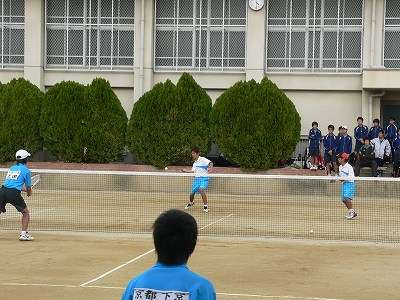 11月3日(土)に加茂川中学校において、男子ソフトテニスの秋季大会が行われました。初めは、先日行われ日没サスペンデッドとなった5・6位決定戦の第3ペアの試合が行われましたが、嵯峨中学校に見事勝利し5位決定戦に駒を進めました。そして、迎えた下京中学校との5位決定戦は、第1ペアは勝利しましたが、第2ペアがフルセットの末敗れました。そして勝敗を決める第3ペアは接戦の末惜しくも敗れ、府下大会出場を逃しました。