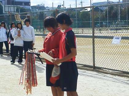 同日に行われた初級の部の決勝戦は、松原中学校に4対1で勝利し、見事優勝しました。12月2日(日)に丹波自然運動公園で行われる京都府中学校ソフトテニス選抜1年生大会への出場を決めました。