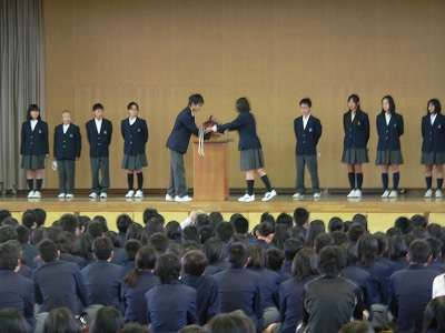 続いて、新生徒会本部役員に校長先生から認証状の授与がありました。どの人も認証状の重みを感じて受け取っていました。そして、旧生徒会長から新生徒会長に思いのつまった生徒会旗の引継がありました。最後に、新生徒会長から「より良い学校づくりのために尽力していきますので、みなさんご協力よろしくお願いします。」と訴えありました。新しい「洛南中学校の顔」というべき新生徒会本部役員の今後のリーダーシップと全校生徒のサポートを期待しています。