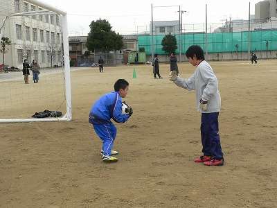 はじめは3人程度で手をつなぎながらつかまえをするなどして、体をほぐしていました。次に先輩からボールを出してもらって、シュートの練習をしていました。小学校の先生がゴールを守っている場面もあり、楽しく頑張っていました。そして、最後のゲーム形式の練習では、真剣みがあふれていました。