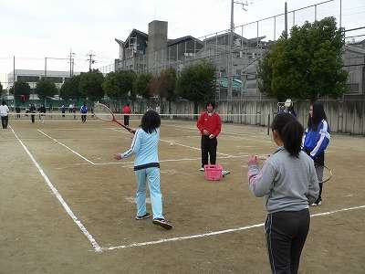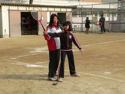 体を温めるためにランニングをしてから、中学生が小学生に素振りの仕方を身振り手振りを交えて丁寧に教えていました。その後、二人一組になって向かい合って、ラケットを使ってワンバンドでボールをやりとりしていました。最後に、中学生が打ちやすい高さにボール出して、小学生が素振りの成果を生かして打っていました。