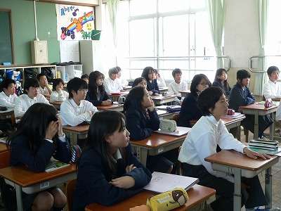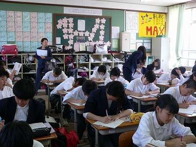 平成25年5月17日(金)6限、1年生の授業を、旧6年生の担任の先生が参観に来られました。懐かしい先生の顔を見て、きょろきょろする場面もありましたが、どのクラスも集中して学習に取り組んでいました。