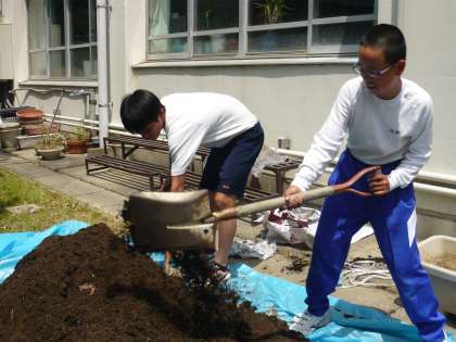 (1) 日曜参観の時に、花の苗植えを行うための土づくりを行ってくれました。