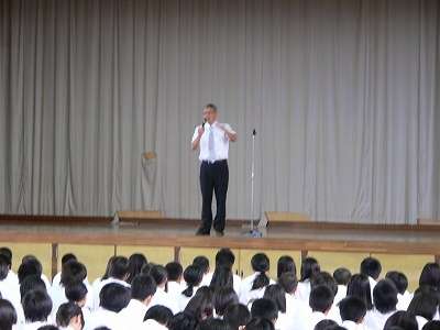 引き続いて、校長先生から、最初に「夏休み中は自分で自分をコントロールして、命落とすようなことがないようにして下さい。そして夏休み明けに必ず元気な姿を見せて下さい」次に「3年生は入試制度が変わる1年目、オープンキャンパスなど参加して、自らの進路を切り拓けるように学習を頑張ってください。2年生は部活動で中心になる次期です。中堅学年として自覚を高め一生懸命に取り組んでください。1年生は中学校生活に慣れたことと思いますが、「自立」と「自律」ができるように頑張ってください。」という話がありました。