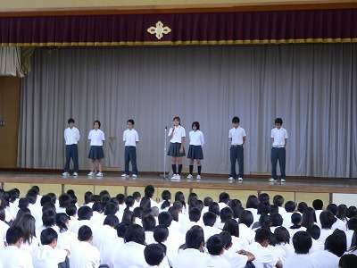 次に、生徒会本部役員や各委員長から、「シャキッと週間」の各学年の結果と分析した内容を報告してくれました。やりぱっなしではなく、現状を及び結果をきちんと分析して今後の課題を全校生徒に訴えてくれたことは、自分たち自身で自浄作用するという意味において、大変有意義であったと思います。