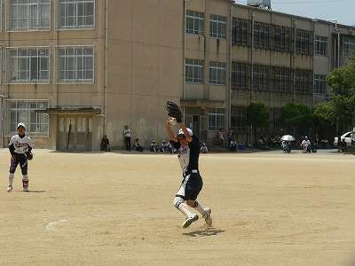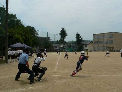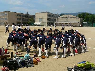 平成25年7月21日(日)に樫原中学校のグラウンドおいて、ソフトボールの準決勝と決勝が行われました。準決勝の相手は衣笠中学校でした。2回表衣笠中の6番バッターがセンター前ヒット、7番バッターがレフト前ヒット、8番バッターがレフト前ヒットと3連打で1点を先制されました。