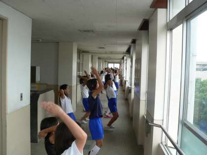 平成25年9月12日(木)に前期期末考査が終了しました。そして、生徒たちがとても楽しみにしている体育祭の色別応援練習の取組が始まりました。体育祭のテーマである「顔晴る姿と本気な姿 〜赤・青・黄・緑、優勝目指して突っ走れ〜」を具現化する取組の一つであり、3年生を中心に男女に分かれて各教室でビデオを見ながら、振り付けを覚えていました。中には、早くも男女全員が廊下に出て太鼓に合わせて練習をしだした団もありました。9月25日(水)の体育祭当日にむけて、各団とも頑張ってください。