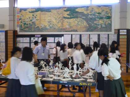 3年生の展示テーマは、「平和への祈り」です。修学旅行で訪れた沖縄の地。ここは、日本で唯一の地上戦が行われた地。68年前の多大なる犠牲は、今なお、私たちに戦争の悲惨さを教えてくれています。一人ひとりが地道に自分のパートを仕上げ、そろったときは本当に美しいものになりました。