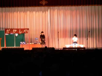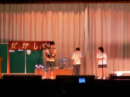 3年生の舞台発表は、友情をテーマに「少年D」という劇を行いました。何をやってもダメでのろまなデゴイチ。そんなデゴイチが、駄菓子屋のおばちゃん、マチコ、山さんと出会い、関わる中で成長していく姿を描きました。そして、自分に負けないデゴイチになろうと走り出します。