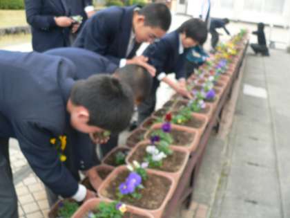 平成25年12月2日(月)に環境委員会が,春に向けてプランターに花の苗を植えてくれました。また,それに先立ち12月1日(日)に,卓球部の生徒が土づくりをして,プランターに入れてくれました。校庭に花がたくさんあると気持ちが和らぎますね。活躍してくれた環境委員会や卓球部のみなさん,本当にお疲れ様でした。