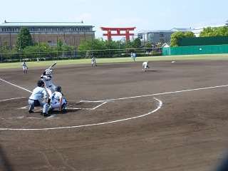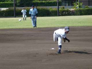 午前9時 岡崎グランドでプレーボール。初回から、両中学校のピッチャーが好投し、緊迫感のある投手戦となりました。5回裏、洛南中学校が、2アウトから、安打と2塁打を放ち、更に相手のエラーから3点を先制し、そのまま逃げ切りました。