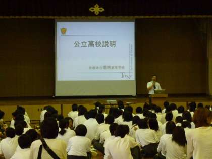 平成26年7月9日(水)第1回進路講話を実施しました。今回は、京都学園高等高校、京都市立塔南高等高校から先生を招き、私立高校、公立高校の受験(検)制度について説明をしていただきました。また、それぞれの学校の特色についてもお話を聞かせていただきました。