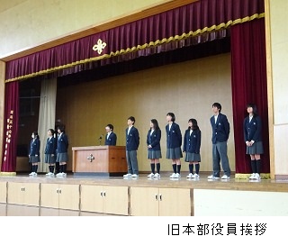 平成27年11月2日(月)本部役員の認証式を行いました。10月30日の本部役員選挙で選ばれた新本部役員が紹介され,一人一人に認証書が手渡されました。認証式の後,本部役員の交代式が行われ旧本部役員から新本部役員に生徒会旗が引き継がれました。