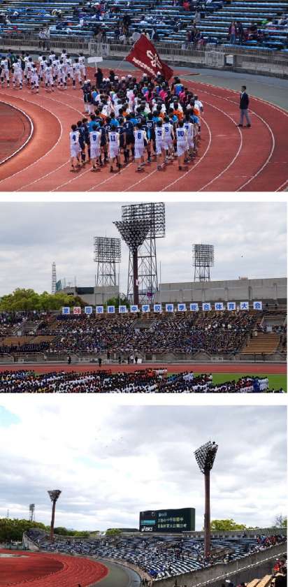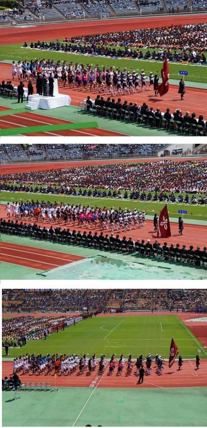 第58回京都市中学校春季総合体育大会開会式が,西京極陸上競技場で開催されました。今年度は88校7119名の選手が,29校780名の吹奏楽部(洛南中学校吹奏楽部も参加)の演奏で行進を行いました。洛南中学校(チーム洛南)は,100名が出場し,会場に響く大きな声を掛け合い,気持ちのこもった堂々とした, 美しい行進を行いました。開会式に向け,行進練習に取り組んできたことだけでなく,日々の部活動での練習に対する姿勢や活動の成果が表れた素晴らしい行進となりました。