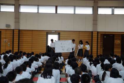校外学習実行委員会の生徒たちがスローガンの発表や,諸注意などを劇形式で発表するなど工夫をした学年集会を企画し,実施しました。