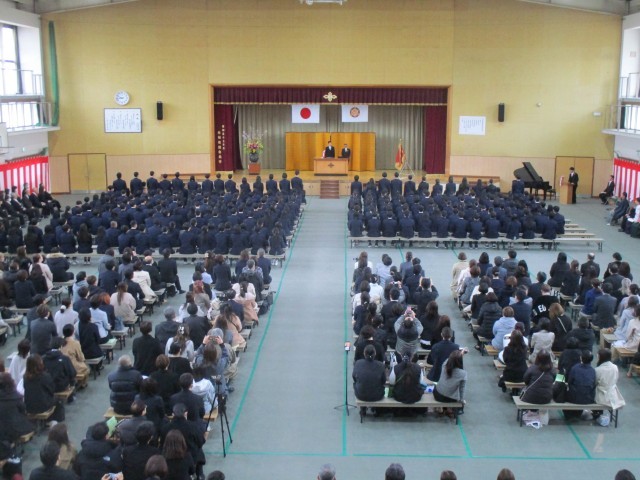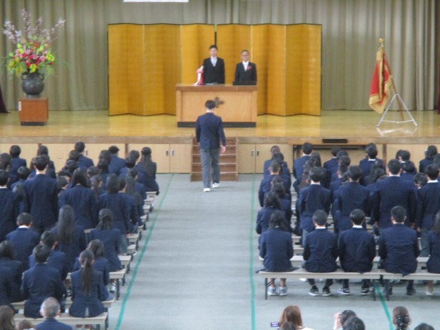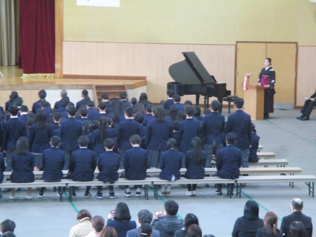 晴れ間ものぞく寒空の下、洛南中学校第78回卒業証書授与式が挙行されました。244名の3年生が学び舎を巣立っていきました。あらためて3年間を振り返ってどんな気持ちでしょうか。中学校の3年間というものは甘く、切なく、濃く、みなさんにとってもそうだったのではないでしょうか。堂々とした入場から呼名、所作、待っている時の姿勢。どれをとっても最高学年にふさわしいものでした。卒業証書授与の時から涙が止まらない人もいましたね。みんなのあふれる思いと優しさが伝わってきました。卒業生代表の答辞はハキハキと話す中に優しさと人柄があふれる内容となりました。最後に同級生に語りかけたあの言葉、みんなこれからの人生でも大切にしていってください。今までの人生もこれからの人生も最後に残るのは友であり人です。これからの卒業生のみなさんの人生に幸あれ!! 洛南中学校教職員一同