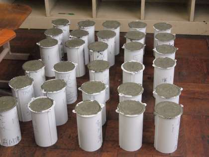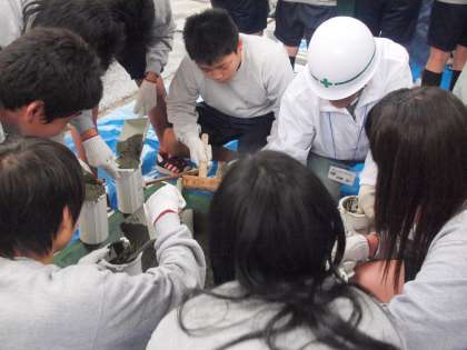 先週中質紙の紙に『10年後の自分へのメッセージ』をそれぞれが書き、ビニル袋に入れ、ペットボトルに乾燥剤と共にテストピースという筒に入れました。8日は小雨も降る寒い中、体育館でのお話、外ではテストピースに自分達で生コンをいれました。生コンの組会の方々に教えてもらいながらちっきりと入れました。
