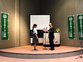 6月28日(金),南区役所ホールで第69回「社会を明るくする運動」標語の表彰式が行われました。今年度のテーマは「きぼう/希望」でしたが,本校からも2名が入選,7名が佳作に選ばれ,代表の生徒が表彰式に出席しました。また,今年度は入選した2年生Hさんが,受賞者代表の言葉を立派に発表してくれました。