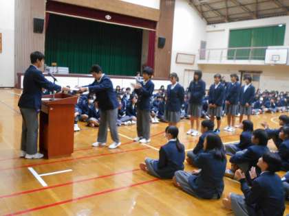 まず旧生徒会長から,新生徒会本部役員へ認証状が渡されました。いよいよ後輩へとバトンが手渡されたことになります。