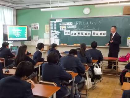 1月15日(水)6限にスクールサポーターの方を各教室にお招きして、薬物乱用防止教室を催しました。スクールサポーターの方から違法薬物は依存症になることや脳細胞を破壊する恐ろしさがあり、犯罪につながる行動をすることや身体をこわすことになると語られました。これからの生活や身体や人間関係を大切にしていくためにも、違法薬物には絶対関わらないようすることが必要であると教えていただきました。