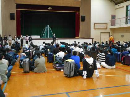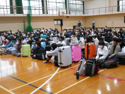 早朝の集合でしたが,生徒の皆さんは笑顔で一杯でした。無事に結団式も終了しました。これから,バスで京都駅へ!