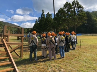 続いての体験学習は,ジップラインです。まずはしっかりと説明を聞いています。