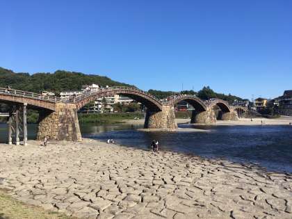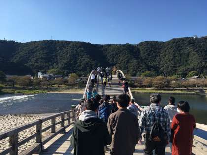 修学旅行 第2日目12 公開日 2020/10/19 更新日 2020/10/19 学校の様子 無事体験活動を終え,バスにて錦帯橋へ移動しました。錦帯橋は,日本三名橋の一つで,5連のアーチが美しい国内屈指の木造橋です。橋を支える伝統工法による木組みが見どころです。 ここで自主行動,クラス写真を撮りました。