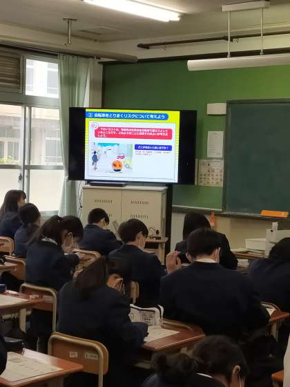 今日の6時間目は講師の方が来られ,みんなに身近な乗り物である自転車についてお話して頂きました。コロナ感染予防のため,各教室でZoomを使ってお話を聞くことになりました。乗り方を誤れば大きな事故につながることやその責任について説明して頂き,改めて交通ルールやマナーを守ることの大切さを実感しましたね。