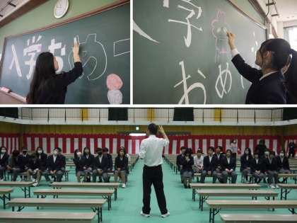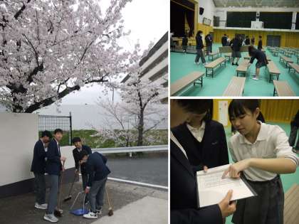 さくら満開 入学式を向かえます。 新たな久世中学校の一員となる皆様へ 最高の入学式を行います。