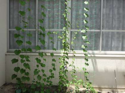 7月に入りました。緑のカーテンは,まだまだ成長中ですが,アサガオが一輪咲きました。