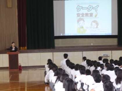 7月4日(水) NTTドコモより講師の方に来ていただき,1年生に携帯電話を使うときの注意,安全な使い方についてお話をしていただきました。まだ,携帯電話を使っていない人もたくさんいると思いますが,『チェーンメールは,絶対に次に回さず自分で終わる。』『インターネットで知り合った人と連絡を取り合うことは大変危険。』ということを強調されていました。