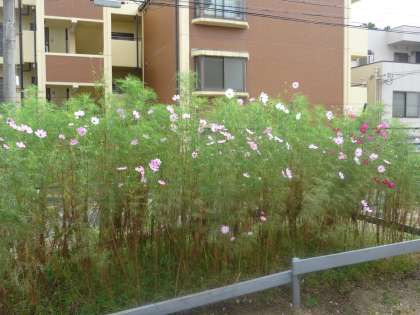 学校の片隅(少し目立たない場所ですが)に今年つくられた畑のコスモスが満開を迎えました。