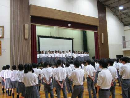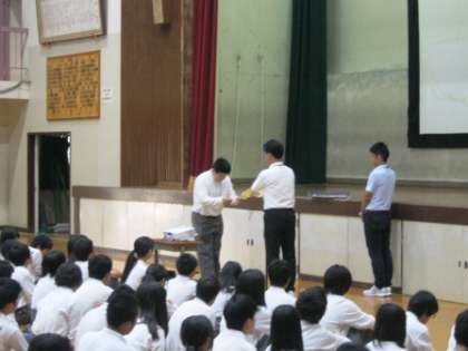 夏季休業明け始業式 公開日 2015/08/24 更新日 2015/08/24 学校の様子 夏休みが終わり、学校に子どもたちの元気な声と笑顔が戻ってきました。 1限の始業式では、校歌斉唱、校長先生のお話、表彰式のあと、夏季大会のVTRを鑑賞しました。これから体育祭、文化祭、合唱祭など大きな行事が続きますが、仲間と力を合わせ、ひたむきにがんばりましょう。 まだまだ、蒸し暑い日が続きますので、体調管理には十分注意しましょう。