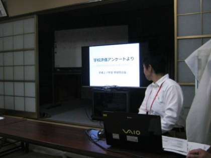 10月29日、30日の夜、各自治会館で今年度の「地域懇談会」を行いました。4月からの各学年の様子をDVDで見ていただいた後、『学校評価アンケート』や『全国学力・学習状況調査』から見えてきた成果や課題をお話しさせていただきました。分散会では各学年ともいろいろなお話ができて有意義な懇談会ができたように思います。保護者ののみなさま、お忙しい時間帯に集まっていただきありがとうございました。
