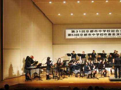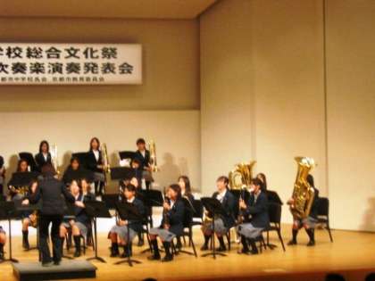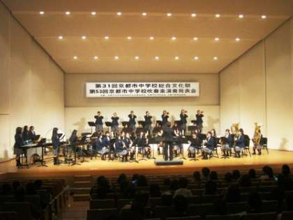 中学校総合文化祭 吹奏楽演奏発表会 公開日 2015/11/02 更新日 2015/11/02 学校の様子 11月1日(日)、右京ふれあい文化会館で、第31回京都市中学校総合文化祭、第53回吹奏楽演奏発表会が開催されました。本校吹奏楽部も参加し、「さくらんぼ」「久石譲作品集より2」「風になりたい」の3曲を合奏してくれました。最後の曲は、後半合唱があったり、日頃の成果を十分発揮してくれました。おつかれさまでした。 ご来場いただきました保護者のみなさま、ありがとうございました。