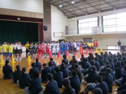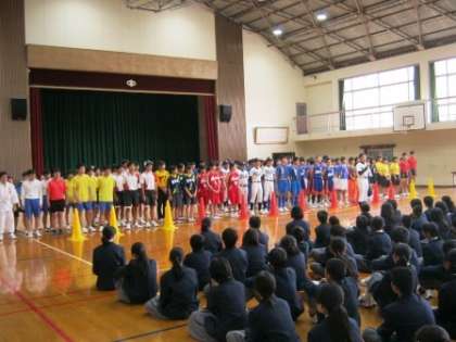 4月27日(木)4限に体育館で「春季総合体育大会激励会」を行いました。運動部各部キャプテンからの決意表明、生徒会代表からの熱いエール、校長先生から激励の言葉がありました。