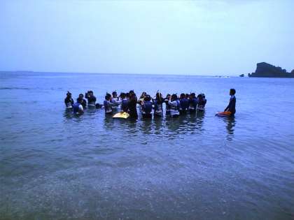 いよいよメインイベント。インストラクターの説明を受け、海に入ります。